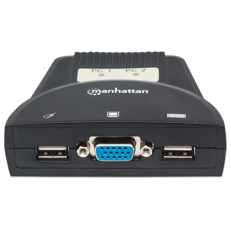 Manhattan Mini Switch KVM de 2 puertos. Tipo de puerto de teclado: USB, Tipo de puerto de ratón: USB, Tipo de puerto de vídeo: VGA. Máxima resolución: 1920 x 1440 Pixeles. Color del producto: Negro. Ancho: 75 mm, Profundidad: 85 mm, Altura: 26 mm