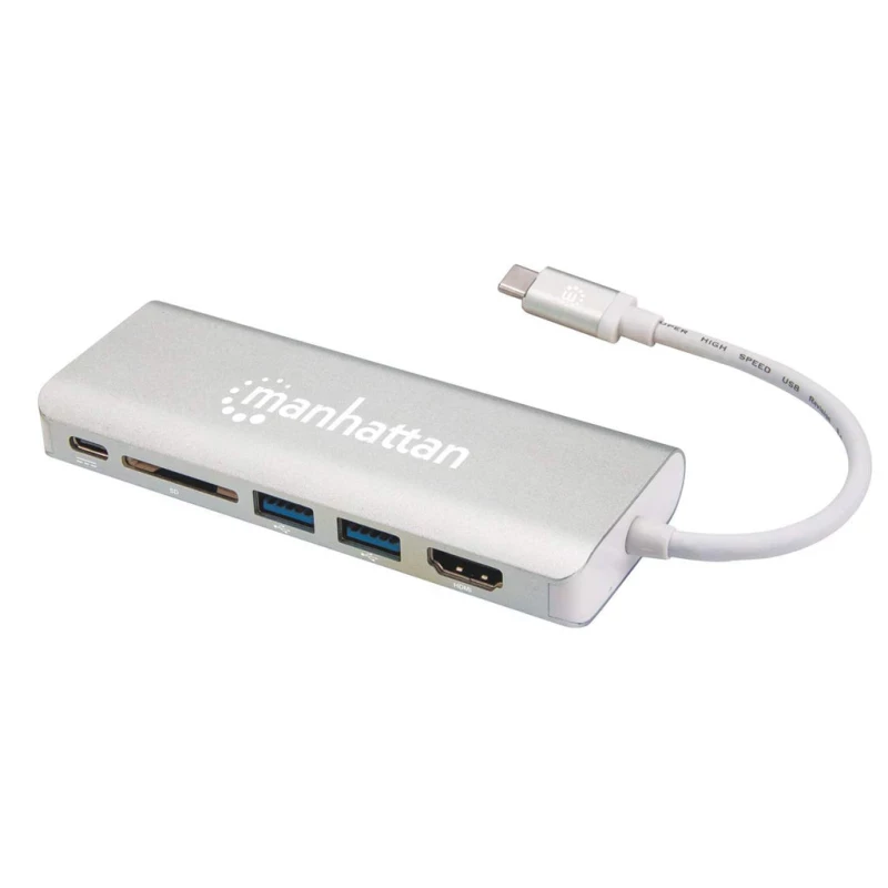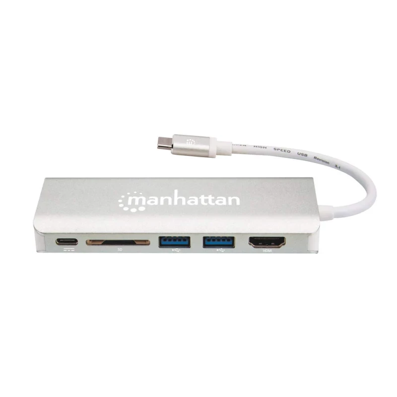 Manhattan Docking Station multiplicador de puertos USB Tipo-C 6 en 1. Tecnología de conectividad: Alámbrico, Interfaz de host: USB 3.2 Gen 2 (3.1 Gen 2) Type-C. Color del producto: Aluminio, Tarjetas de memoria compatibles: SD, SDHC, SDXC, Material de la cubierta: Aluminio. Voltaje de salida: 5 V, Corriente de salida: 2 A. Ancho: 45 mm, Profundidad: 275 mm, Altura: 15 mm. Cantidad por paquete: 1 pieza(s)