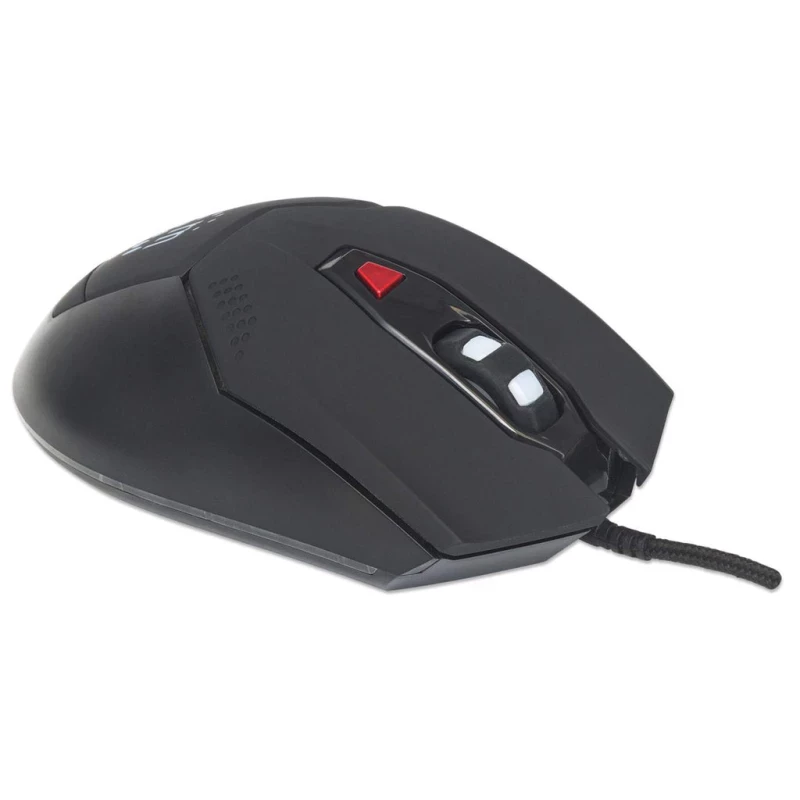 Manhattan Ratón óptico cableado para videojuegos con LED. Factor de forma: Ambidiestro. Tecnología de detección de movimientos: Óptico, Interfaz del dispositivo: USB tipo A, Resolución de movimiento: 2400 DPI, Tipo de botones: Botones presionados, Cantidad de botones: 6, Tipo de desplazamiento: Rueda. Fuente de energía: Cable. Color del producto: Negro