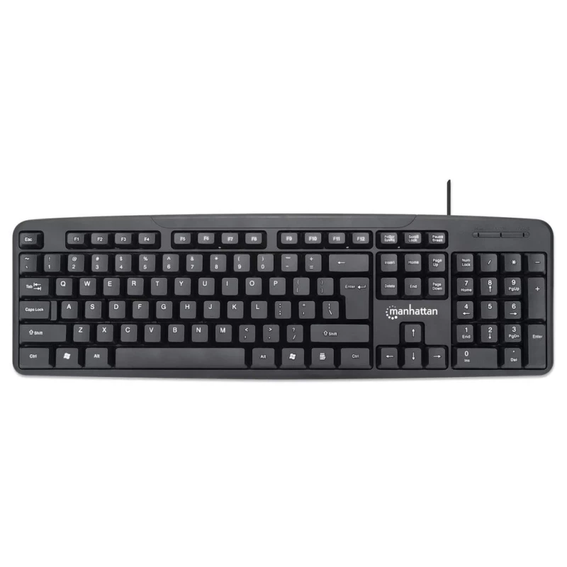 Manhattan Juego de teclado y mouse óptico, cableados. Formato del teclado: Tamaño completo (100%). Estilo de teclado: Derecho. Tecnología de conectividad: Alámbrico, Interfaz del dispositivo: USB, Interruptor del teclado: Interruptor de membrana, Diseño de teclado: QWERTY, Uso recomendado: Universal. Color del producto: Negro. Ratón incluido