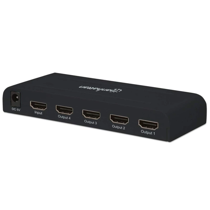 Manhattan Video Splitter HDMI 4K de 4 puertos. Tipo de puerto de vídeo: HDMI, Salida de vídeo: 4x HDMI. Máxima resolución: 3840 x 2160 Pixeles, Color del producto: Negro, Profundidad de color: 48 Bit. Voltaje de salida: 15 V. Dimensiones (Ancho x Profundidad x Altura): 54 x 142 x 21 mm, Peso: 300 g