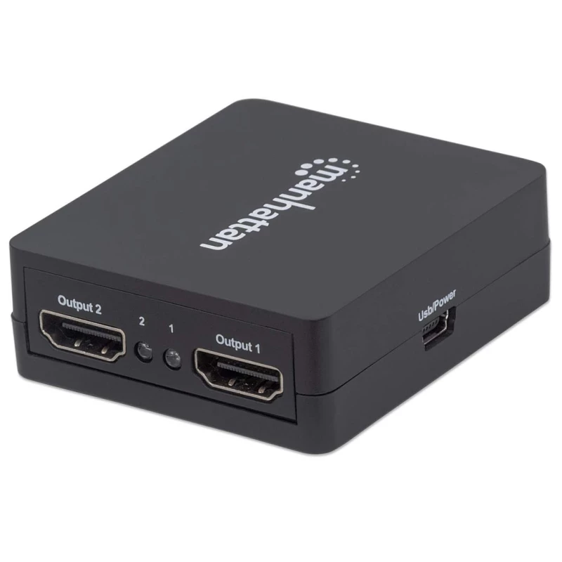 Manhattan Video Splitter HDMI de 2 puertos, 1080p. Tipo de puerto de vídeo: HDMI, Salida de vídeo: 2x HDMI, Versión HDMI: 1.3b. Máxima resolución: 1920 x 1200 Pixeles, Color del producto: Negro, Material de la cubierta: Plástico. Consumo energético: 5 W. Ancho: 54 mm, Profundidad: 60 mm, Altura: 20 mm. Cables incluidos: USB