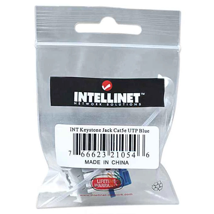 Intellinet JACK RJ45 CAT5E KEYSTONE DE IMPACTO AZUL. Tipo de construcción: Plano, Color del producto: Azul, Conector 1: RJ-45. Ancho: 18 mm, Profundidad: 28.3 mm, Altura: 20.8 mm. Cantidad por paquete: 1 pieza(s)