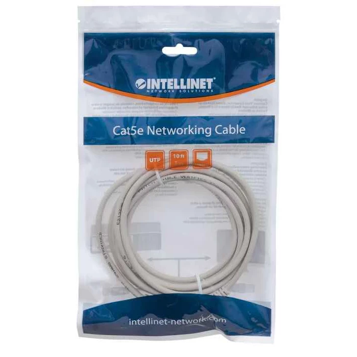 Intellinet Cable de red, Cat5e, UTP. Longitud de cable: 3 m, Cable estándar: Cat5e, Blindaje de cable: U/UTP (UTP), Conector 1: RJ-45, Conector 2: RJ-45, Contactos del conector chapado: Oro, Color del producto: Gris