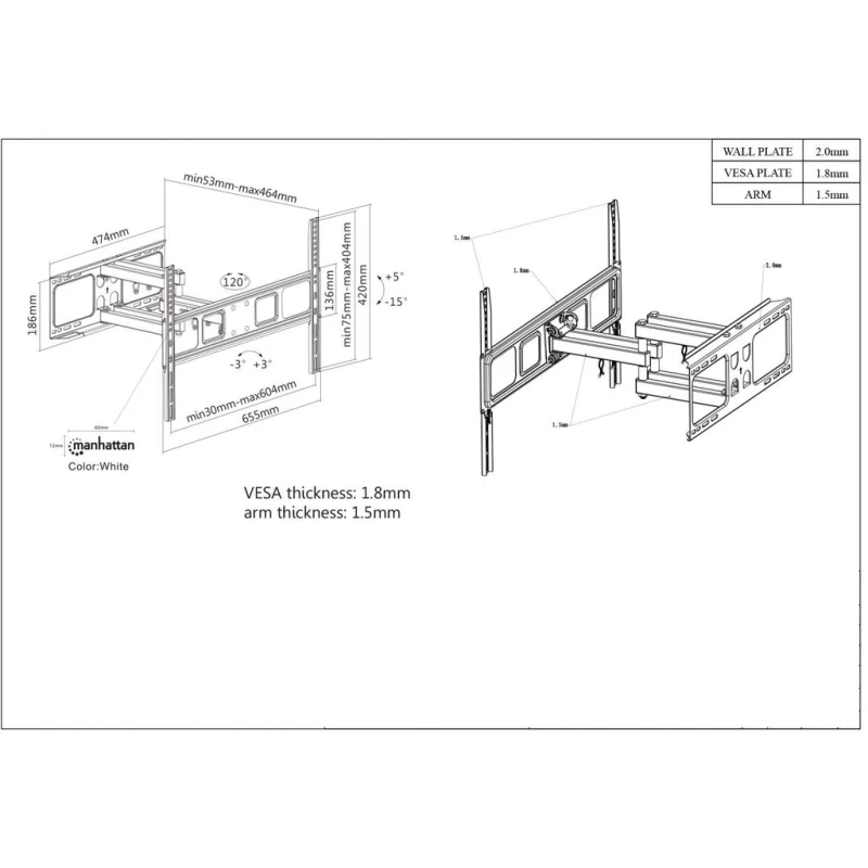 Manhattan Soporte Universal de Pared para TV, con Movimiento Completo, Básico. Capacidad máxima de peso: 40 kg, Tamaño mínimo de pantalla: 94 cm (37"), Tamaño máximo de pantalla: 177.8 cm (70"), Montaje VESA mínimo: 100 x 100 mm, Montaje VESA máximo: 600 x 400 mm. Ángulo de giro (alcance): -60 - 60°, Ángulo de inclinación: -15 - 5°. Color del producto: Negro