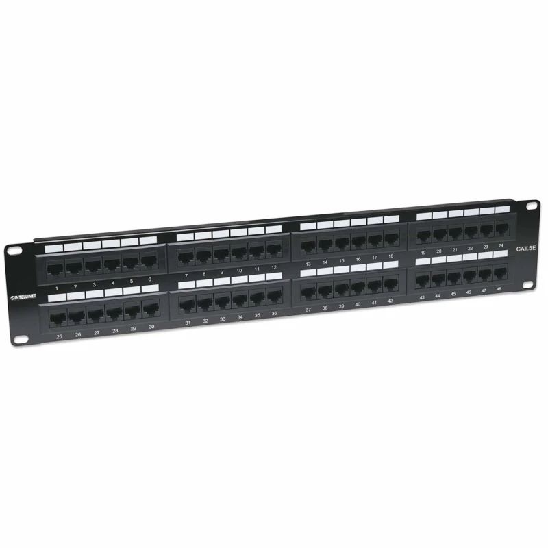 Intellinet Panel de Parcheo Cat5e. Estándares de red: IEEE 802.3, IEEE 802.3ab, IEEE 802.3u, Tipo de interfaz ethernet: Ethernet rápido, Gigabit Ethernet, Conector: RJ-45. Color del producto: Negro, Montaje: Montaje en bastidor, Capacidad del rack: 2U. Ancho: 88 mm, Altura: 48 mm, Profundidad: 482 mm