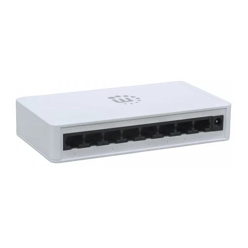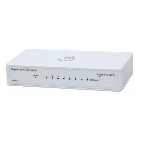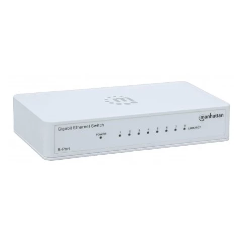Manhattan Switch de Escritorio Gigabit Ethernet de 8 puertos. Puertos tipo básico de conmutación RJ-45 Ethernet: Gigabit Ethernet (10/100/1000), Cantidad de puertos básicos de conmutación RJ-45 Ethernet: 8. Bidireccional completo (Full duplex). Tabla de direcciones MAC: 2048 entradas, Capacidad de conmutación: 16 Gbit/s. Estándares de red: IEEE 802.3, IEEE 802.3ab, IEEE 802.3az, IEEE 802.3u, IEEE 802.3x. Voltaje de entrada DC: 5 V. Conector eléctrico: Toma de entrada de CC