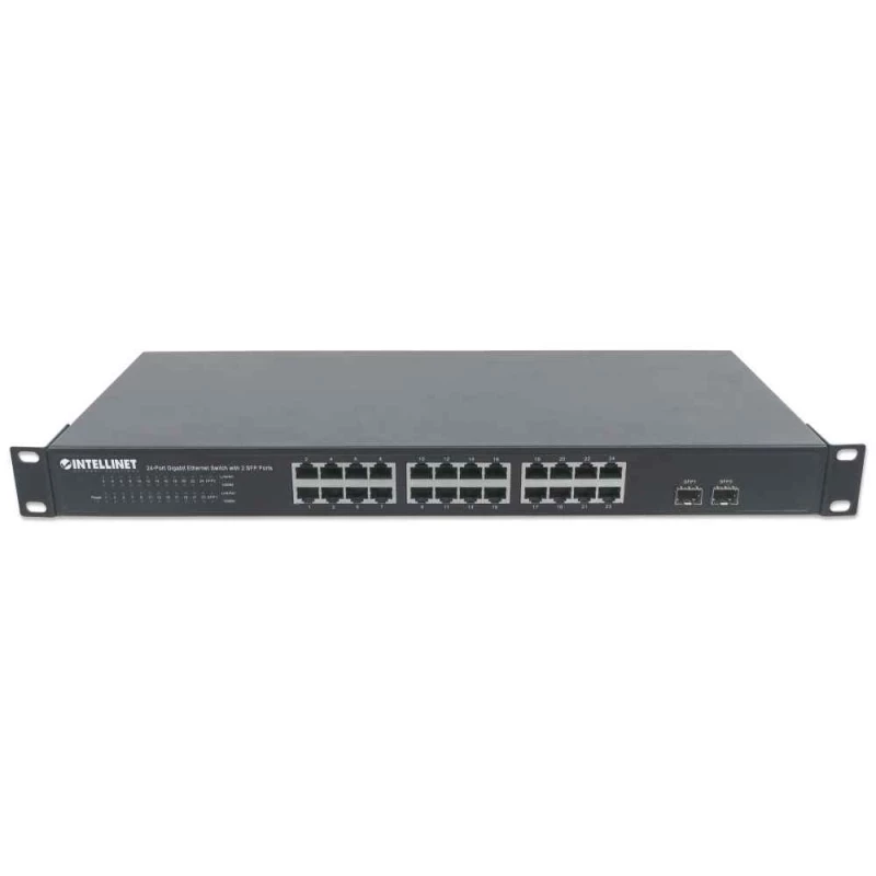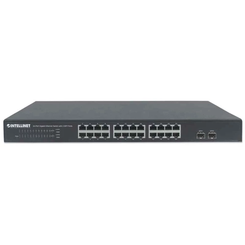 Switch Intellinet Switch de 24 Puertos Gigabit Ethernet con 2 puertos SFP, No administrado, L2, Gigabit Ethernet (10/100/1000), Bidireccional completo (Full duplex), Montaje en rack, 1U