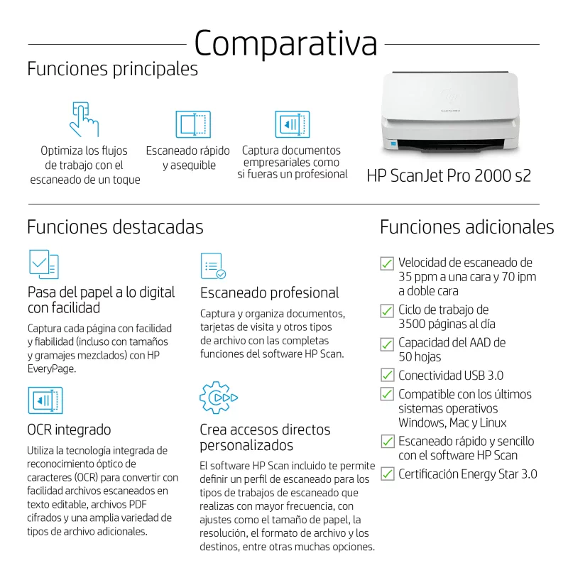 Escáner HP Scanjet Pro 2000 s2 Sheet-feed Scanner, 600 x 600 DPI, 3500 páginas, Escáner alimentado con hojas, Negro, Blanco, CMOS CIS, 3000 páginas