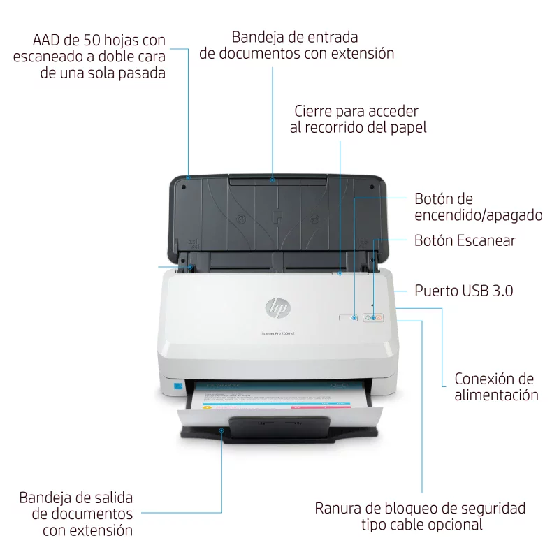 HP Scanjet Pro 2000 s2 Sheet-feed Scanner. Resolución óptica de escáner: 600 x 600 DPI, Duración diaria de la batería: 3500 páginas. Tipo de escaneado: Escáner alimentado con hojas, Color del producto: Negro, Blanco. Tipo de sensor: CMOS CIS, Ciclo de trabajo diario (máx.): 3000 páginas, Funciones de los botones: Escaneo en escala de grises. Capacidad del alimentador automático de documentos: 50 hojas. Tamaño máximo de papel ISO A-series: A4