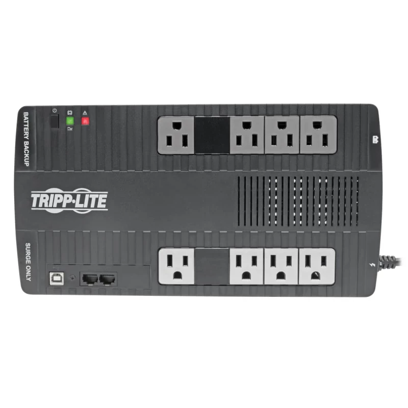 Tripp Lite AVR550U UPS Interactivo de 550VA 300W - 8 Tomacorrientes NEMA 5-15R, AVR, 120V, 50/60Hz, USB, Instalación en pared o escritorio. Topología UPS: Línea interactiva, Capacidad de potencia de salida (VA): 0.55 kVA, Potencia de salida: 300 W. Tipo de salida AC: NEMA 5–15R, Conector: NEMA 5-15P, Cantidad de salidas AC: 8 salidas AC. Voltaje de la pila: 12 V, Tiempo típico de respaldo a media carga: 9 min, Tiempo de recarga de la batería: 9 h. Factor de forma: Tower, Color del producto: Negro, Material de la cubierta: Acrilonitrilo butadieno estireno (ABS). Certificados de cumplimiento: RoHS, Certificación: UL1778, CSA, NOM, FCC