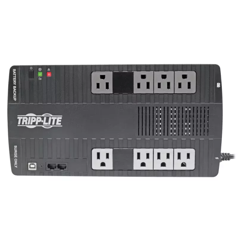 Tripp Lite AVR700U UPS Interactivo de 700VA 350W - 8 Tomacorrientes NEMA 5-15R, AVR, 120V, 50Hz / 60Hz, USB, Instalación en pared o escritorio. Topología UPS: Línea interactiva, Capacidad de potencia de salida (VA): 0.7 kVA, Potencia de salida: 350 W. Tipo de salida AC: NEMA 5–15R, Conector: NEMA 5-15P, Cantidad de salidas AC: 8 salidas AC. Tecnología de batería: Sealed Lead Acid (VRLA), Tiempo típico de respaldo a carga completa: 2 min, Tiempo típico de respaldo a media carga: 10 min. Factor de forma: Tower, Color del producto: Negro, Material de la cubierta: Acrilonitrilo butadieno estireno (ABS). Certificados de cumplimiento: RoHS, Certificación: UL1778; CSA; NOM; FCC 15 B