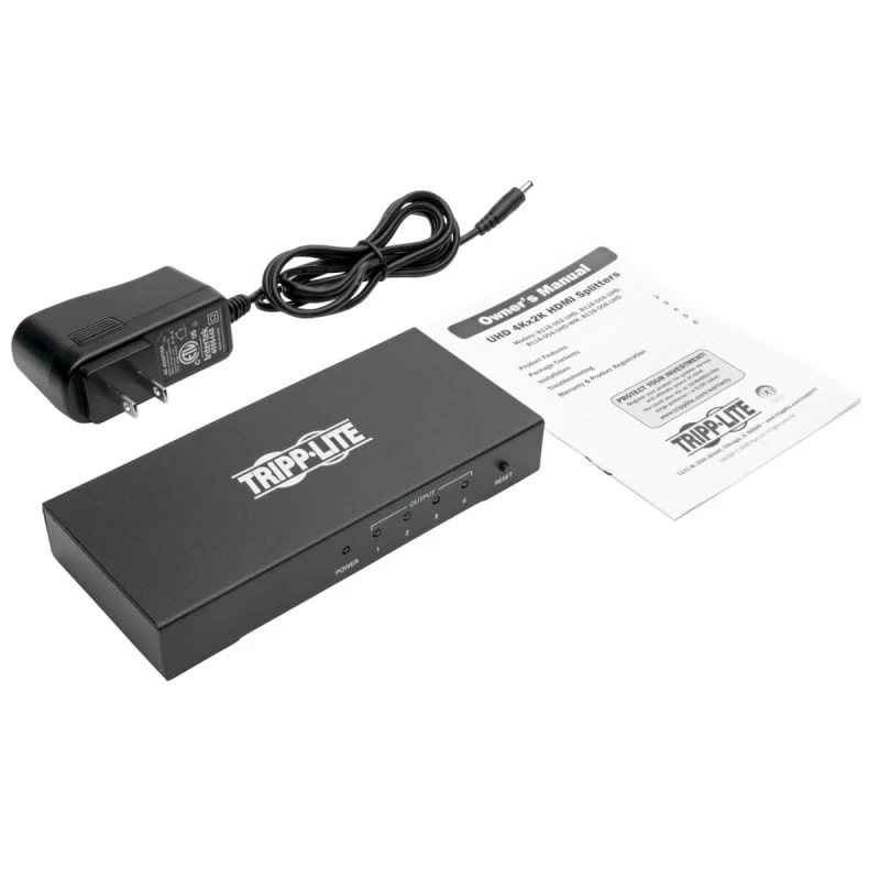 Tripp Lite B118-004-UHD Divisor HDMI de 4 puertos - 4K, HDCP 1.3. Tipo de puerto de vídeo: HDMI, Salida de vídeo: 4x HDMI. Máxima resolución: 3840 x 2160 Pixeles, Color del producto: Negro, Ancho de banda: 340 MHz. Voltaje de entrada AC: 5 V. Ancho: 154.9 mm, Profundidad: 68.6 mm, Altura: 22.9 mm. Ancho del paquete: 254 mm, Largo del paquete: 200.7 mm, Alto del paquete: 66 mm