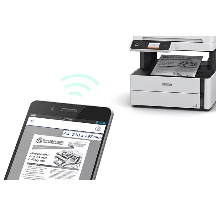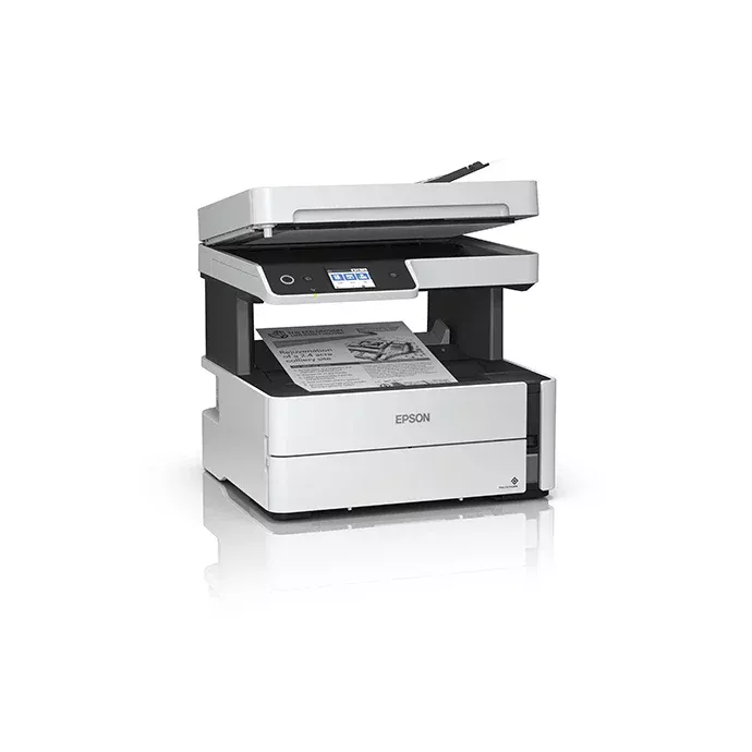 Epson EcoTank ET-M3180. Tecnología de impresión: Inyección de tinta, Impresión: Impresión en blanco y negro, Resolución máxima: 1200 x 2400 DPI. Copiando: Copias en blanco y negro, Resolución máxima de copia: 600 x 600 DPI. Escaneando: Escaneo a color, Resolución óptica de escáner: 1200 x 2400 DPI. Enviando por fax: Fax a color. Tamaño máximo de papel ISO A-series: A4. Wifi. Impresión directa. Color del producto: Gris, Blanco