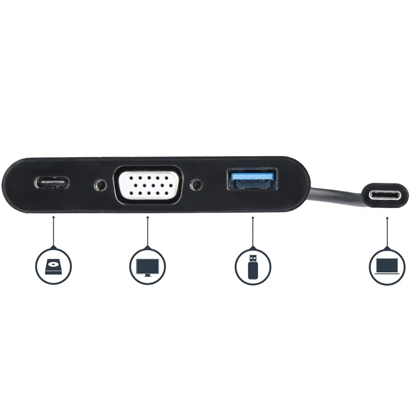 StarTech.com Adaptador Multifunción USB-C a VGA con Entrega de Potencia (Power Delivery) y Puerto USB-A. Tecnología de conectividad: Alámbrico, Interfaz de host: USB 3.2 Gen 1 (3.1 Gen 1) Type-C, Envío de energía de USB hasta: 60 W. Color del producto: Negro, Velocidad de transferencia de datos: 5 Gbit/s, Resolución (máxima analógica): 2048 x 1280 Pixeles. Tipo de alimentación: USB. Ancho: 40 mm, Profundidad: 80 mm, Altura: 15 mm. Ancho del paquete: 145 mm, Largo del paquete: 171 mm, Alto del paquete: 34 mm