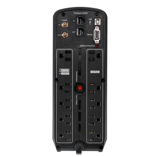 CyberPower CP1500PFCLCD. Topología UPS: Línea interactiva, Capacidad de potencia de salida (VA): 1.5 kVA, Potencia de salida: 900 W. Tipo de salida AC: NEMA 5–15R, Cantidad de salidas AC: 10 salidas AC. Tecnología de batería: Sealed Lead Acid (VRLA), Tiempo típico de respaldo a carga completa: 2 min, Tiempo típico de respaldo a media carga: 11 min. Factor de forma: Tower, Color del producto: Negro, Longitud de cable: 1.52 m. Software incluido: PowerPanel Personal Edition