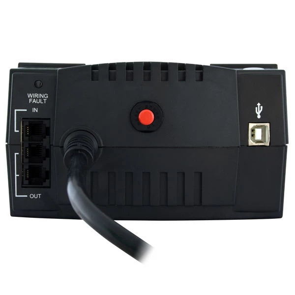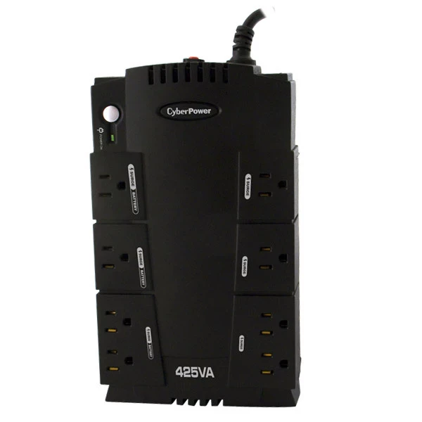 CyberPower CP425SLG. Capacidad de potencia de salida (VA): 0.425 kVA, Potencia de salida: 255 W, Frecuencia de entrada: 50/60 Hz. Tipo de salida AC: NEMA 5–15R, Cantidad de salidas AC: 8 salidas AC. Tecnología de batería: Sealed Lead Acid (VRLA), Tiempo típico de respaldo a carga completa: 2 min, Tiempo típico de respaldo a media carga: 7 min. Factor de forma: Compacto, Color del producto: Negro, Longitud de cable: 1.52 m. Tipo de batería: 12V/3.6AH, Voltaje nominal de salida: 120 V, Voltaje nominal de entrada: 96-140 V