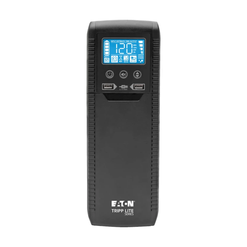 Tripp Lite ECO1000LCD UPS Interactivo con USB y 8 tomacorrientes - 120V, 1000VA, 600W, 50Hz / 60Hz, AVR, Serie ECO, ENERGY STAR. Topología UPS: Línea interactiva, Capacidad de potencia de salida (VA): 1 kVA, Potencia de salida: 600 W. Tipo de salida AC: NEMA 5–15R, Conector: NEMA 5-15P, Cantidad de salidas AC: 8 salidas AC. Tiempo típico de respaldo a carga completa: 2 min, Tiempo típico de respaldo a media carga: 7 min, Tiempo de recarga de la batería (90%): 7 h. Factor de forma: Tower, Color del producto: Negro, Material de la cubierta: Acrilonitrilo butadieno estireno (ABS). Certificados de cumplimiento: RoHS