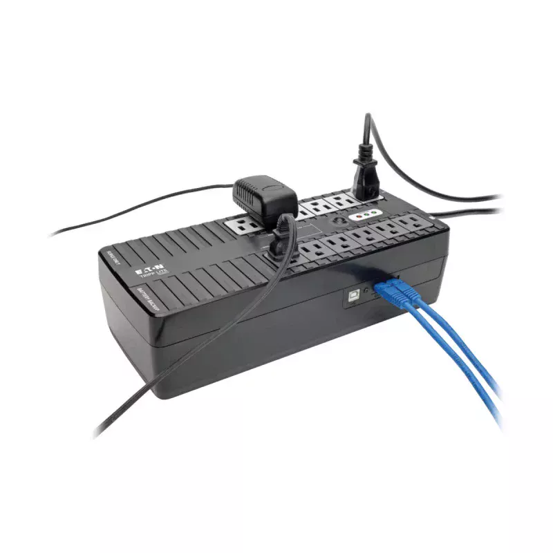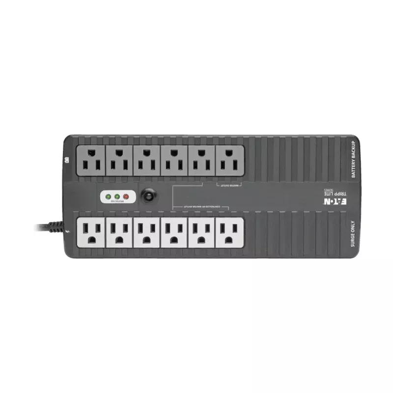 Tripp Lite ECO750UPS UPS Standby de 750VA 450W - 12 Tomacorrientes NEMA 5-15R, 120V, 50Hz / 60Hz, Clavija 5-15P, ENERGY STAR, Instalación en Pared o Escritorio. Topología UPS: En espera (Fuera de línea), Capacidad de potencia de salida (VA): 0.75 kVA, Potencia de salida: 450 W. Tipo de salida AC: NEMA 5–15R, Conector: NEMA 5-15P, Cantidad de salidas AC: 12 salidas AC. Tiempo típico de respaldo a carga completa: 2 min, Tiempo típico de respaldo a media carga: 8.6 min. Factor de forma: Compacto, Color del producto: Negro, Material de la cubierta: Acrilonitrilo butadieno estireno (ABS). Certificados de cumplimiento: RoHS