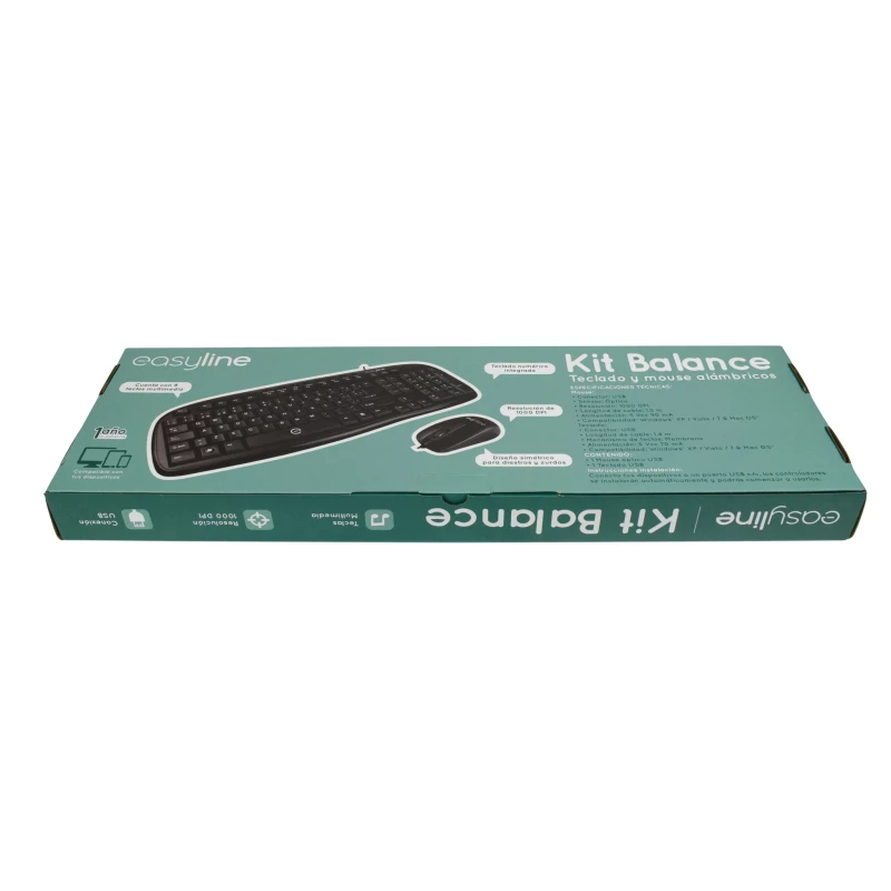 Easy Line Kit de teclado y mouse - Negro, 1000 DPI. Formato del teclado: Tamaño completo (100%). Estilo de teclado: Derecho. Tecnología de conectividad: Alámbrico, Interfaz del dispositivo: USB, Diseño de teclado: QWERTY. Longitud de cable: 1.4 m. Uso recomendado: Universal. Color del producto: Negro. Ratón incluido