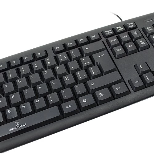 Perfect Choice PC-201038. Formato del teclado: Tamaño completo (100%). Estilo de teclado: Derecho. Tecnología de conectividad: Alámbrico, Interfaz del dispositivo: USB, Interruptor del teclado: Interruptor de membrana, Diseño de teclado: QWERTY. Longitud de cable: 1.5 m. Uso recomendado: Hogar. Color del producto: Negro
