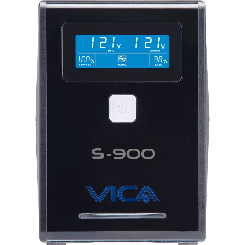 Vica S900. Capacidad de potencia de salida (VA): 0.9 kVA, Potencia de salida: 550 W, Voltaje de entrada de operación (min): 81 V. Tipo de salida AC: NEMA 5–15R, Cantidad de salidas AC: 6 salidas AC. Tiempo típico de respaldo a carga completa: 5 min, Tiempo típico de respaldo a media carga: 18 min, Tiempo de recarga de la batería: 4 h. Factor de forma: Compacto, Color del producto: Negro, Tipo de visualizador: LCD. Ancho: 100 mm, Profundidad: 290 mm, Altura: 140 mm