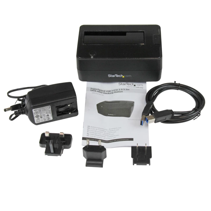 StarTech.com Docking Station USB 3.0 (5Gbps) a SATA de 1 Bahía para Disco Duro - Base USB 3.0 (5Gbps) para Discos Duros SSD de 2,5/3,5 SATA I/II/III - de Carga Superior. Tipo de medio de almacenamiento: Unidad de disco duro, SSD, Interfaz de unidad de almacenamiento: SATA, Serial ATA II, Serial ATA III, Tamaños de almacenamiento en disco soportados: 2.5,3.5". Interfaz de host: USB 3.2 Gen 1 (3.1 Gen 1) Type-B. Rango de transferencia de datos (max): 5 Gbit/s, Color del producto: Negro, Materiales: Plástico. Voltaje de entrada AC: 110-240 V, Voltaje de salida: 12 V, Corriente de salida: 2.5 A. Sistemas operativos Windows soportados: Windows 2000, Windows 2000 Professional, Windows 7 Home Basic, Windows 7 Home Basic x64, Windows 7..., Sistemas operativos Mac soportados: Mac OS X 10.6 Snow Leopard, Mac OS X 10.7 Lion, Mac OS X 10.8 Mountain Lion, Mac OS X 10.9 Mavericks
