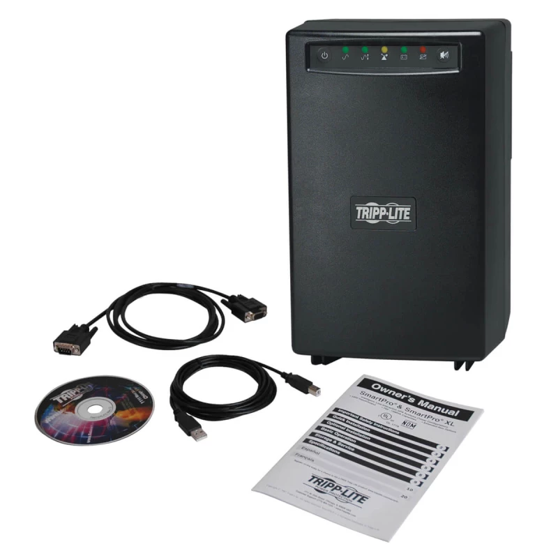 Tripp Lite SMART1500 UPS SmartPro Interactivo de 120V, 1.5kVA y 980W, Torre, USB, DB9, 6 Tomacorrientes. Topología UPS: Línea interactiva, Capacidad de potencia de salida (VA): 1.5 kVA, Potencia de salida: 980 W. Tipo de salida AC: NEMA 5–15R, Conector: NEMA 5-15P, Cantidad de salidas AC: 6 salidas AC. Tiempo típico de respaldo a carga completa: 7 min, Tiempo típico de respaldo a media carga: 20 min, Tiempo de recarga de la batería: 4 h. Factor de forma: Tower, Color del producto: Negro, Material de la cubierta: Cloruro de polivinilo (PVC). Ancho: 190.5 mm, Profundidad: 235 mm, Altura: 330.2 mm