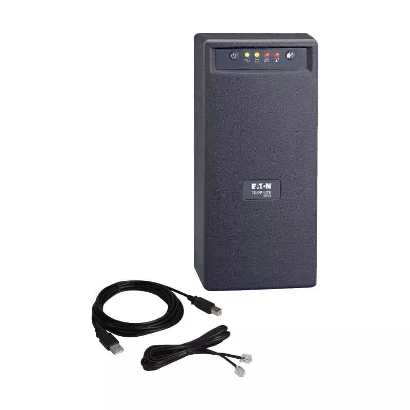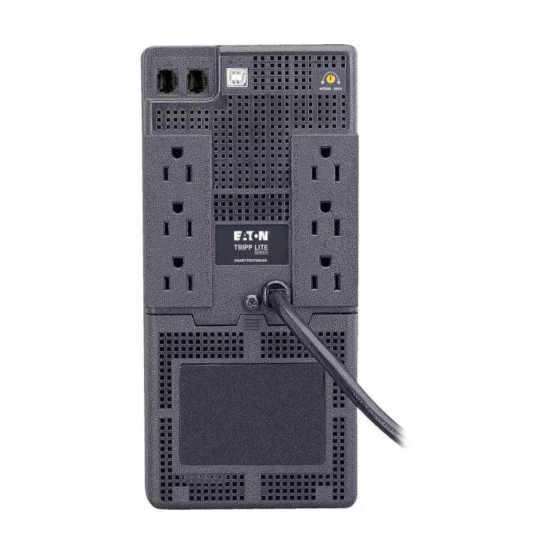 Tripp Lite SMART750USB UPS interactivo SmartPro de 120V, 750VA y 450W, AVR, torre, USB, tomacorrientes solo para sobretensiones. Topología UPS: Línea interactiva, Capacidad de potencia de salida (VA): 0.75 kVA, Potencia de salida: 450 W. Tipo de salida AC: NEMA 5–15R, Conector: NEMA 5-15P, Cantidad de salidas AC: 6 salidas AC. Tiempo típico de respaldo a carga completa: 2.2 min, Tiempo típico de respaldo a media carga: 8.3 min, Tiempo de recarga de la batería: 4.5 h. Factor de forma: Tower, Color del producto: Negro, Material de la cubierta: Cloruro de polivinilo (PVC). Certificados de cumplimiento: RoHS, Certificación: UL1778, CSA, NOM, FCC