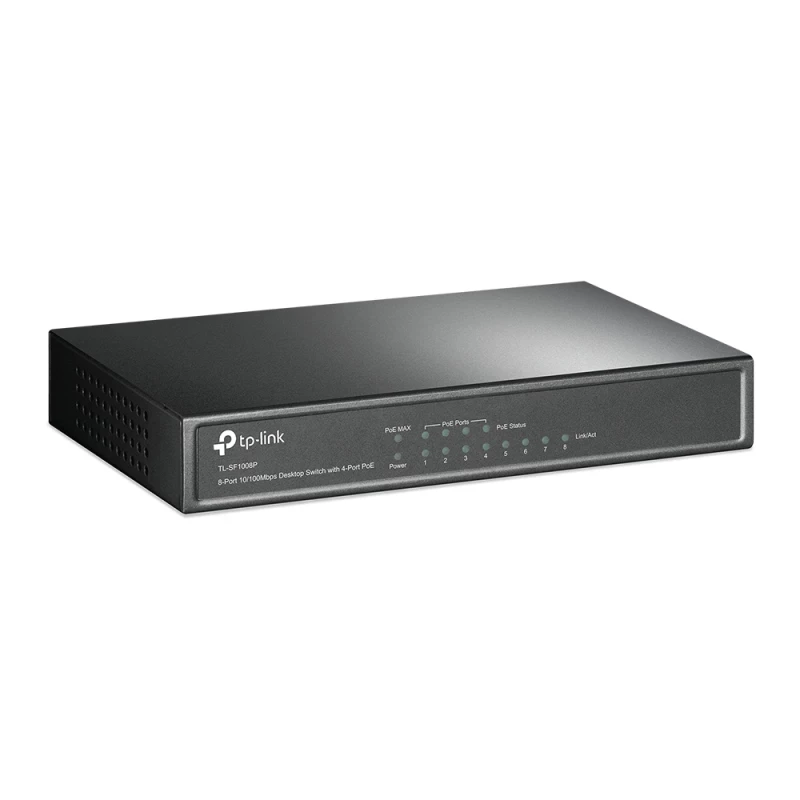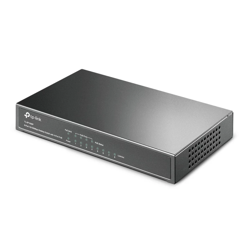 TP-Link TL-SF1008P. Tipo de interruptor: No administrado. Puertos tipo básico de conmutación RJ-45 Ethernet: Fast Ethernet (10/100), Cantidad de puertos básicos de conmutación RJ-45 Ethernet: 8. Bidireccional completo (Full duplex). Tabla de direcciones MAC: 2000 entradas, Capacidad de conmutación: 1.6 Gbit/s. Estándares de red: IEEE 802.1Qbb. Voltaje de entrada DC: 48 V. Conector eléctrico: Toma de entrada de CC. Energía sobre Ethernet (PoE)