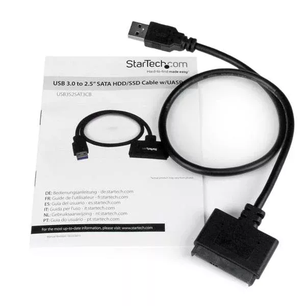StarTech.com Cable SATA a USB con UASP. Color del producto: Negro, Velocidad de transferencia de datos: 6 Gbit/s, Certificación: CE, FCC, REACH. Ancho: 49 mm, Profundidad: 500 mm, Altura: 9 mm. Ancho del paquete: 220 mm, Largo del paquete: 198 mm, Alto del paquete: 10 mm. Longitud de cable: 0.5 m, Circuito integrado: ASMedia - ASM1153E