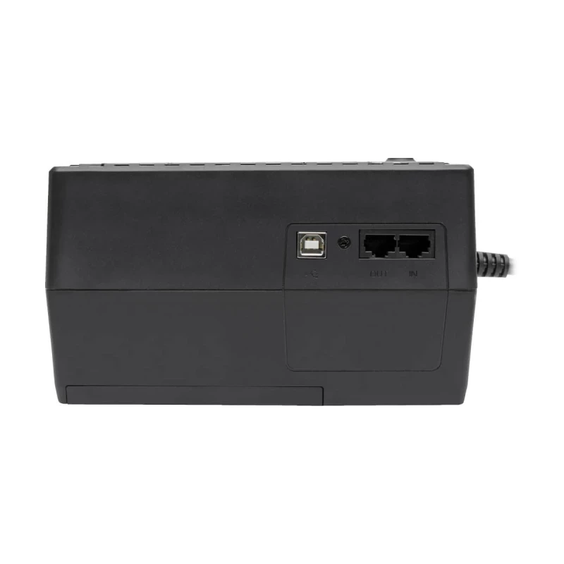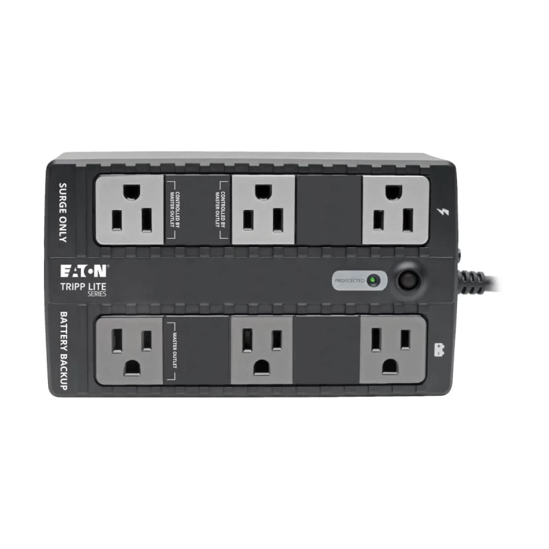 Tripp Lite ECO350UPS UPS Standby de 350VA 210W - 6 Tomacorrientes NEMA 5-15R, 120V, 50Hz / 60Hz, Clavija 5-15P, ENERGY STAR, Instalación en Pared o Escritorio. Topología UPS: En espera (Fuera de línea), Capacidad de potencia de salida (VA): 0.35 kVA, Potencia de salida: 210 W. Tipo de salida AC: NEMA 5–15R, Conector: NEMA 5-15P, Cantidad de salidas AC: 6 salidas AC. Tiempo típico de respaldo a carga completa: 2 min, Tiempo típico de respaldo a media carga: 8 min. Factor de forma: Tower, Color del producto: Negro, Material de la cubierta: Acrilonitrilo butadieno estireno (ABS). Certificados de cumplimiento: RoHS