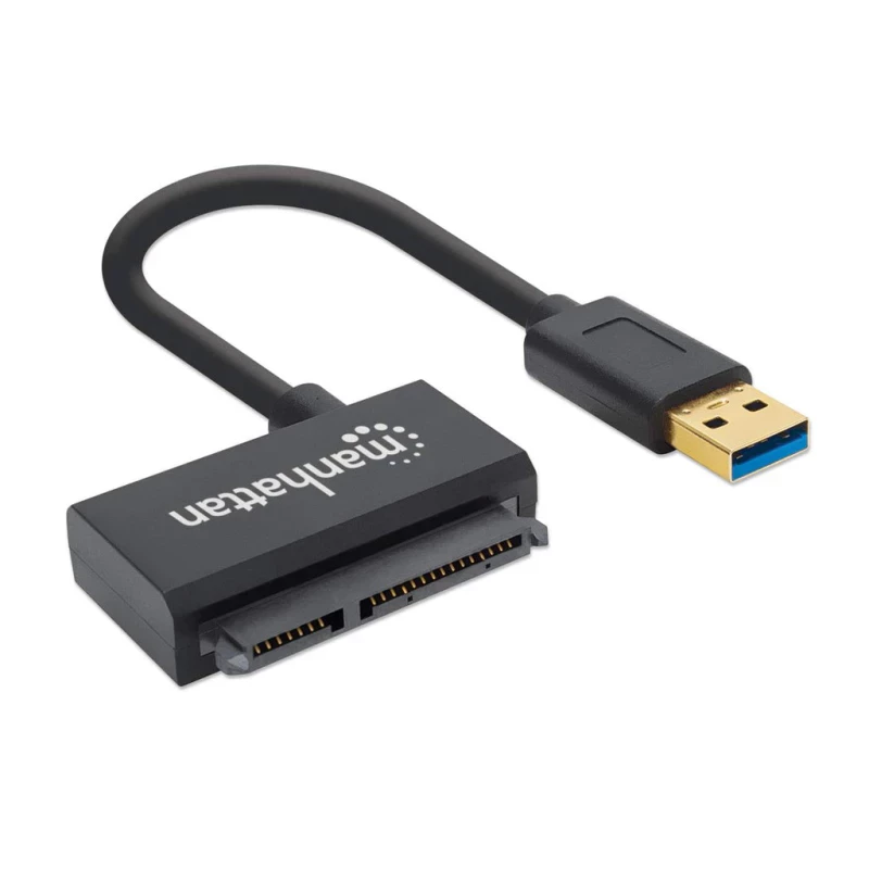 Manhattan Adaptador USB SuperSpeed a SATA. Interfaz de host: USB tipo A, Interfaz de salida: SATA. Color del producto: Negro. Ancho: 28 mm, Profundidad: 73 mm, Altura: 11 mm. Cantidad por paquete: 1 pieza(s), Cables incluidos: USB, Tipo de empaque: Blister. Velocidad de transferencia de datos: 5 Gbit/s, Longitud de cable: 0.42 m, Sistemas operativos compatibles: Windows XP/Vista/7/8 Mac 9.x/10.x & Linux