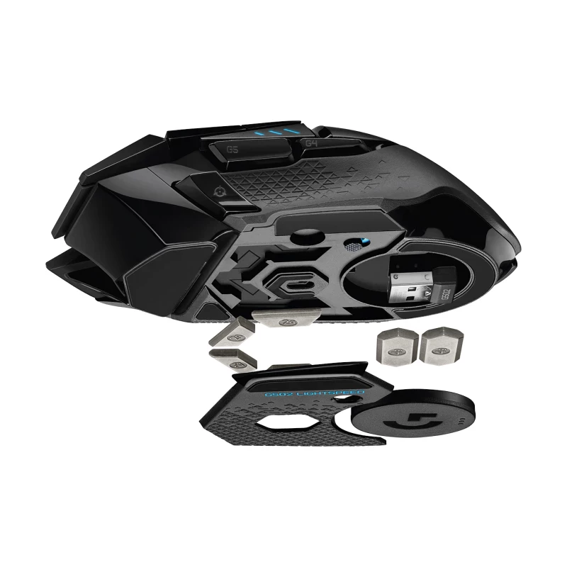 Logitech G G502. Factor de forma: Diestro. Tecnología de detección de movimientos: Óptico, Interfaz del dispositivo: RF inalámbrico, Resolución de movimiento: 16000 DPI, Tiempo de respuesta: 1 ms, Tipo de botones: Botones presionados, Cantidad de botones: 11, Tipo de desplazamiento: Rueda, Aceleración (máx.): 40 G. Iluminación de color: Multi. Fuente de energía: Baterías. Color del producto: Negro