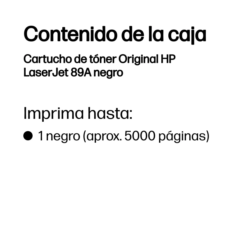 HP Cartucho original de tóner negro 89A LaserJet. Rendimiento de páginas de tóner negro: 5000 páginas, Colores de impresión: Negro, Cantidad por paquete: 1 pieza(s)