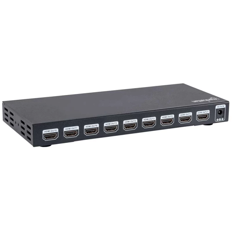 Manhattan Splitter HDMI 4K de 8 puertos. Tipo de puerto de vídeo: HDMI, Salida de vídeo: 8x HDMI. Máxima resolución: 4096 x 2160 Pixeles, Color del producto: Negro, Profundidad de color: 48 Bit. Voltaje de entrada AC: 5 V. Dimensiones (Ancho x Profundidad x Altura): 142 x 54 x 21 mm, Peso: 300 g