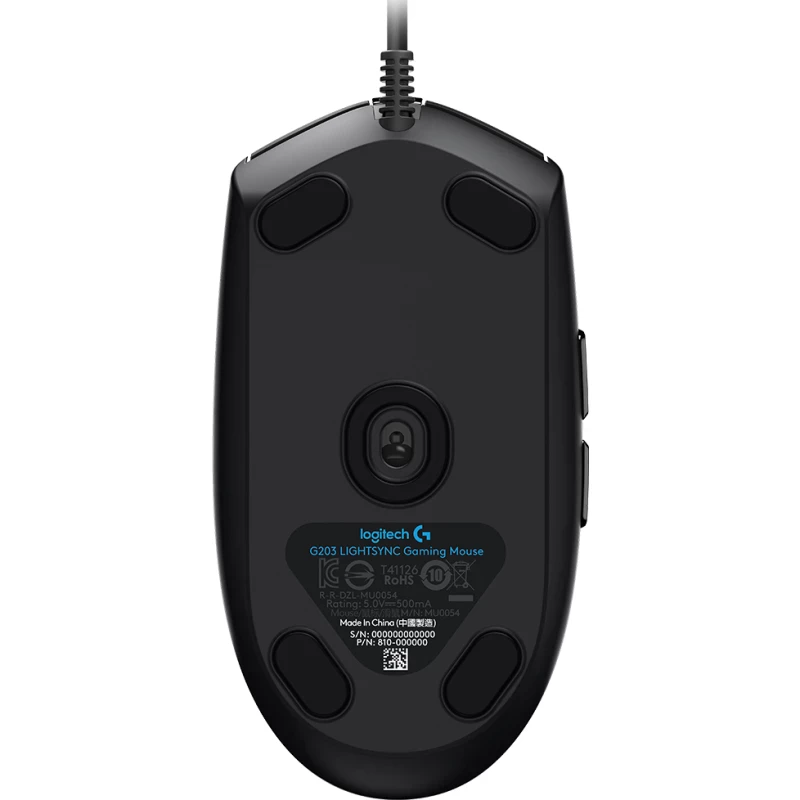 Logitech G G203. Interfaz del dispositivo: USB tipo A, Resolución de movimiento: 8000 DPI, Tiempo de respuesta: 1 ms, Tipo de botones: Botones presionados, Cantidad de botones: 6, Tipo de desplazamiento: Rueda. Iluminación de color: Azul, Verde, Rojo. Fuente de energía: Cable. Color del producto: Negro