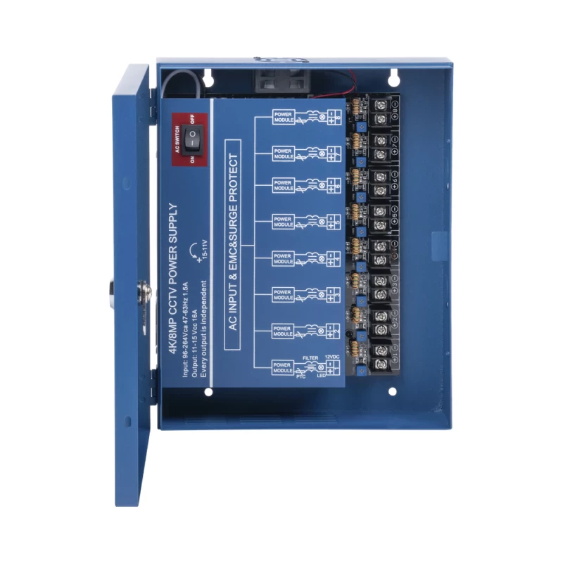 Epcom XP8-DC-16-4KV. Utilizar con: Cámara de seguridad, Tipo de fuente de alimentación: Interior, Voltaje de entrada: 110 - 220 V. Color del producto: Azul. Ancho: 255 mm, Profundidad: 265 mm, Altura: 80 mm. Cantidad por paquete: 1 pieza(s)