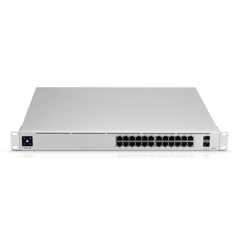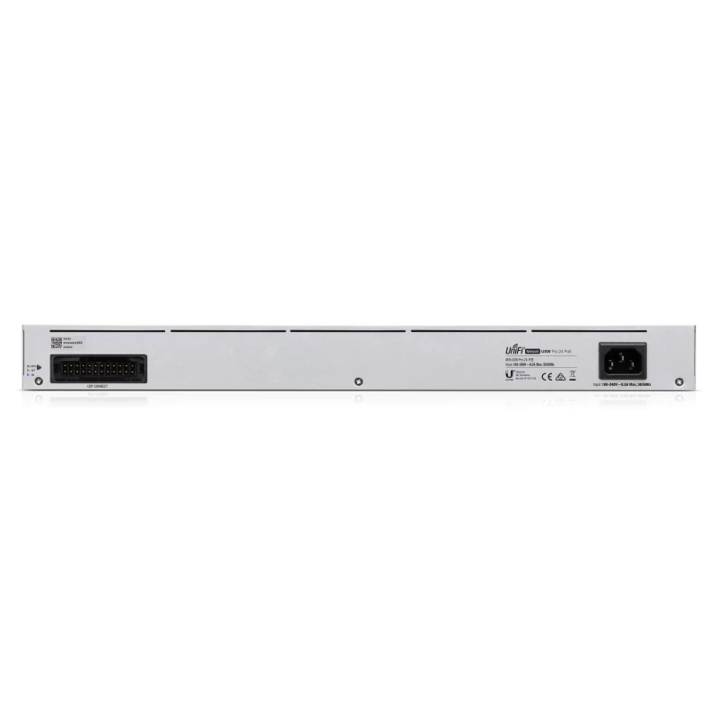 Ubiquiti UniFi Pro 24-Port PoE. Tipo de interruptor: Gestionado, Capa del interruptor: L2/L3. Puertos tipo básico de conmutación RJ-45 Ethernet: Gigabit Ethernet (10/100/1000), Cantidad de puertos básicos de conmutación RJ-45 Ethernet: 24. Bidireccional completo (Full duplex). Capacidad de conmutación: 88 Gbit/s. Estándares de red: IEEE 802.3af, IEEE 802.3at. Voltaje de entrada DC: 52 V. Energía sobre Ethernet (PoE). Montaje en rack, Factor de forma: 1U