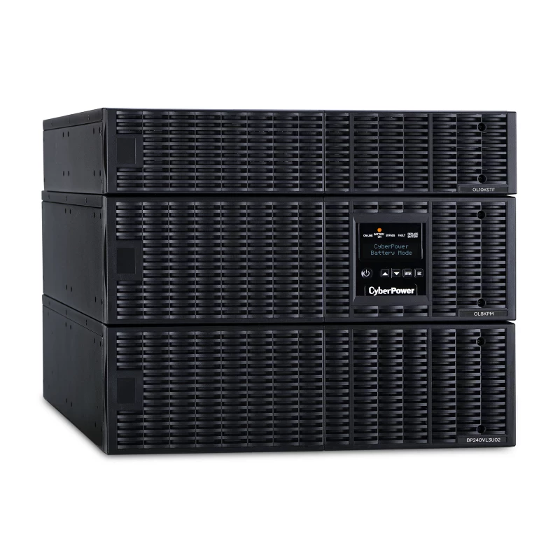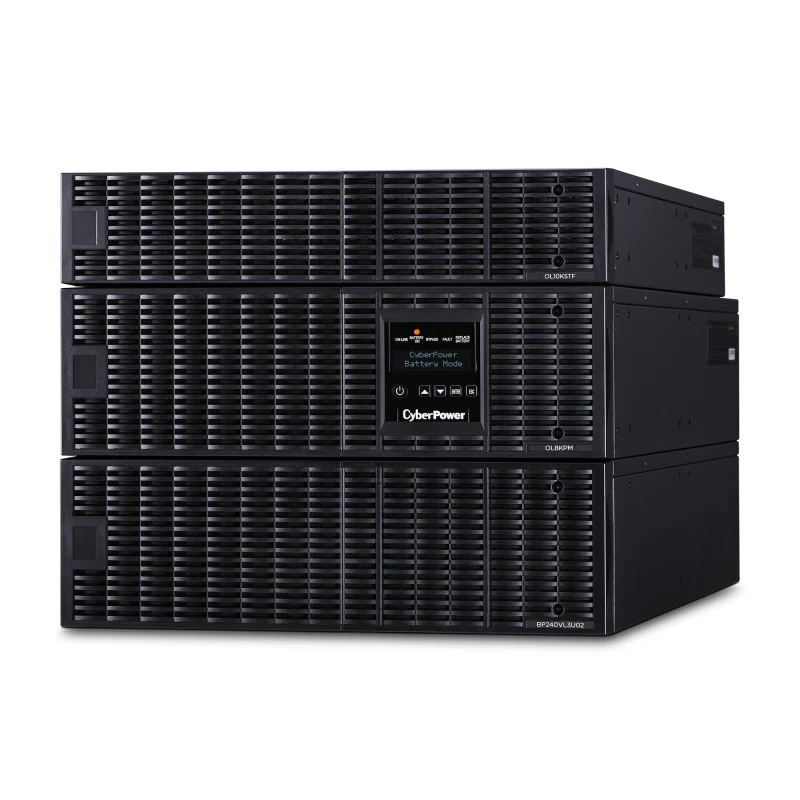 CyberPower OL8KRTF. Topología UPS: Doble conversión (en línea), Capacidad de potencia de salida (VA): 8 kVA, Potencia de salida: 8000 W. Tipo de salida AC: NEMA 5–20R, NEMA L6-30R, Terminal, Cantidad de salidas AC: 10 salidas AC, Tipo de puerto USB: USB Tipo B. Tecnología de batería: Sealed Lead Acid (VRLA), Capacidad de la batería: 9 Ah, Voltaje de la pila: 12 V. Factor de forma: Montaje en rack/Torre o Montaje en bastidor/Torre, Color del producto: Negro, Material de la cubierta: Acero. Ancho: 433 mm, Profundidad: 660 mm, Altura: 352 mm