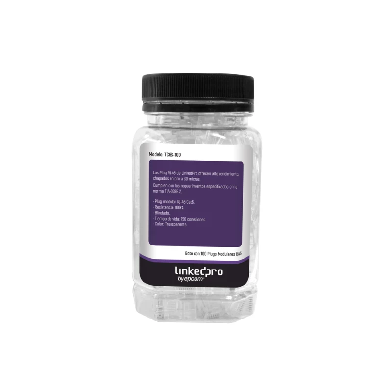 LinkedPRO TC6S-100. Conector: RJ-45, Color del producto: Transparente, Cable estándar: Cat6. Cantidad por paquete: 100 pieza(s), Tipo de empaque: Jarra de plástico