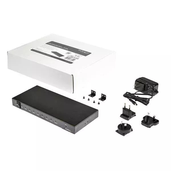 StarTech.com Divisor Splitter HDMI de 8 Puertos - 4K 60Hz con Audio 7.1. Tipo de puerto de vídeo: HDMI, Salida de vídeo: 8x HDMI. Máxima resolución: 3840 x 2160 Pixeles, Color del producto: Negro, Tipo HD: 4K Ultra HD. Voltaje de entrada AC: 100 - 240 V, Corriente de entrada: 0.6 A, Voltaje de salida: 5 V. Ancho: 110 mm, Profundidad: 258 mm, Altura: 26 mm. Ancho del paquete: 260 mm, Largo del paquete: 325 mm, Alto del paquete: 70 mm