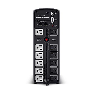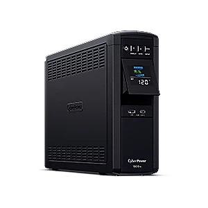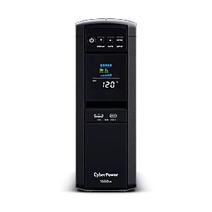 CyberPower CP1500PFCLCDa. Topología UPS: Línea interactiva, Capacidad de potencia de salida (VA): 1.5 kVA, Potencia de salida: 1000 W. Tipo de salida AC: NEMA 5–15R, Cantidad de salidas AC: 12 salidas AC, Tipo de puerto USB: USB tipo A. Factor de forma: Tower, Color del producto: Negro, Tipo de visualizador: LCD. Ancho: 100 mm, Profundidad: 280 mm, Altura: 355 mm