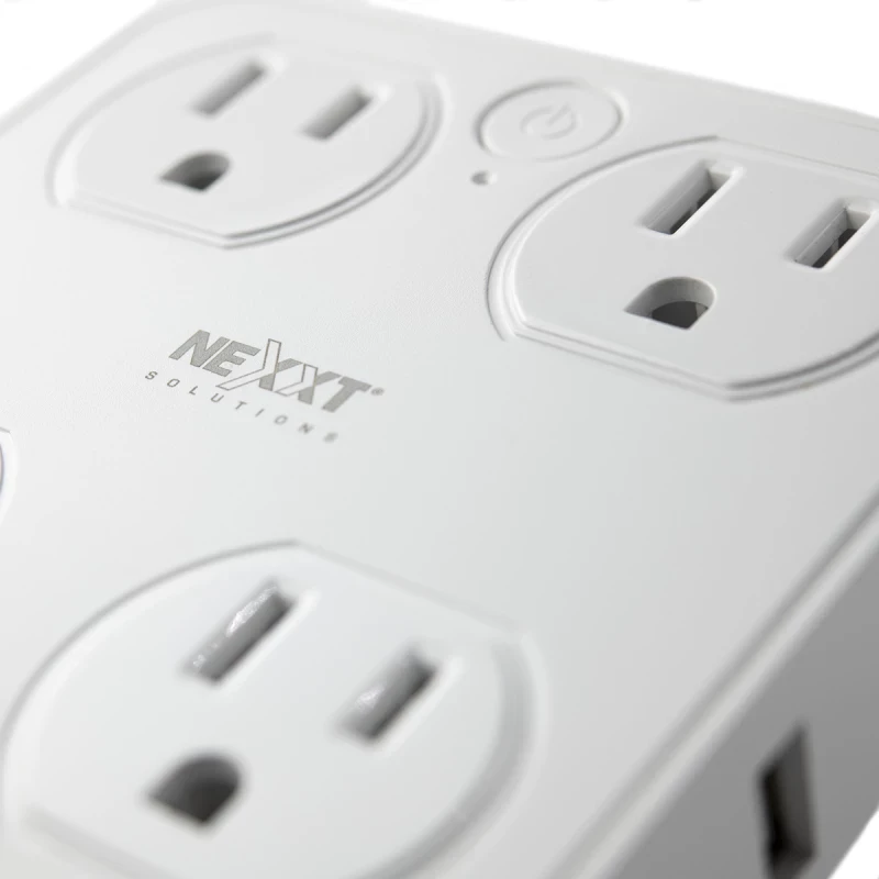 Nexxt Solutions NHP-T610. Índice de aumento de energía: 900 J, Cantidad de salidas AC: 4 salidas AC, Tipo de salida AC: NEMA 5–15R. Conector: NEMA 5–15P. Color del producto: Blanco, Materiales: Plástico. Peso: 229.63 g, Ancho: 99.1 mm, Profundidad: 99.1 mm. Certificación: FCC