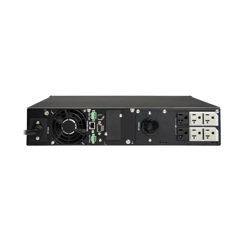 Un tomacorriente L5-20R y seis tomacorrientes 5-20R administrados proporcionan a los equipos conectados una salida de onda sinusoidal pura de CA y le permiten supervisar el consumo de potencia hasta el nivel del grupo de tomacorrientes. La potencia que estos tomacorrientes proporcionan se filtra para proteger los equipos conectados contra sobretensiones dañinas y ruido en la línea. Cuatro tomacorrientes 5-20R se dividen en dos bancos de carga controlables de forma independiente que le permiten desconectar las cargas no críticas a fin de extender la autonomía para las cargas críticas. Los ventiladores de enfriamiento delanteros y traseros ayudan a proteger el equipo contra el sobrecalentamiento.