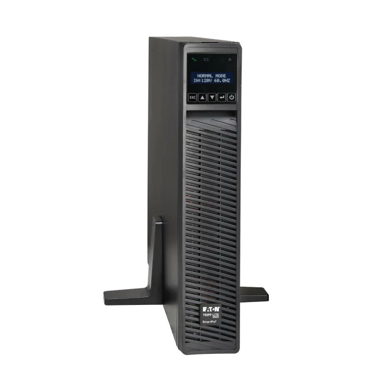 El SMART2200RM2UN se puede instalar en solo 2 U de espacio en un rack estándar EIA de 19 pulgadas utilizando el hardware incluido. Con 23.7 pulgadas de profundidad, el UPS se instala en racks de poca profundidad y otros espacios compactos. También puede adaptarlo para su instalación en torre utilizando los soportes incluidos. El cable de alimentación de 10 pies con enchufe NEMA 5-20P se conecta a un tomacorriente de CA compatible.