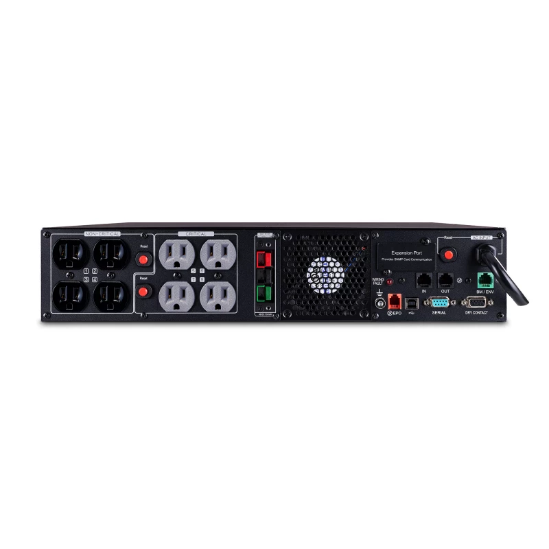CyberPower PR1500RTXL2U. Topología UPS: Línea interactiva, Capacidad de potencia de salida (VA): 1.5 kVA, Potencia de salida: 1500 W. Tipo de salida AC: NEMA 5–15R, Cantidad de salidas AC: 8 salidas AC, Tipo de serie de interfaz: RS-232. Tecnología de batería: Sealed Lead Acid (VRLA), Capacidad de la batería: 9 Ah, Voltaje de la pila: 12 V. Factor de forma: Montaje en rack/Torre o Montaje en bastidor/Torre, Color del producto: Negro, Capacidad del rack: 2U. Ancho: 433 mm, Profundidad: 412 mm, Altura: 86.5 mm