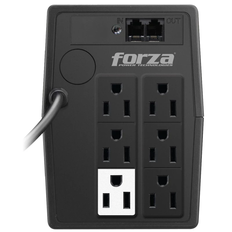 Forza Power Technologies NT-1011. Capacidad de potencia de salida (VA): 1 kVA, Potencia de salida: 500 W, Forma de onda: Seno. Tipo de salida AC: NEMA 5-15R, Conector: NEMA 5-15P, Cantidad de salidas AC: 6 salidas AC. Capacidad de la batería: 9 Ah, Voltaje de la pila: 12 V, Tiempo típico de respaldo a media carga: 32 min. Color del producto: Negro, Material de la cubierta: Acrilonitrilo butadieno estireno (ABS), Longitud de cable: 1.2 m. Ancho: 101 mm, Profundidad: 279 mm, Altura: 142 mm