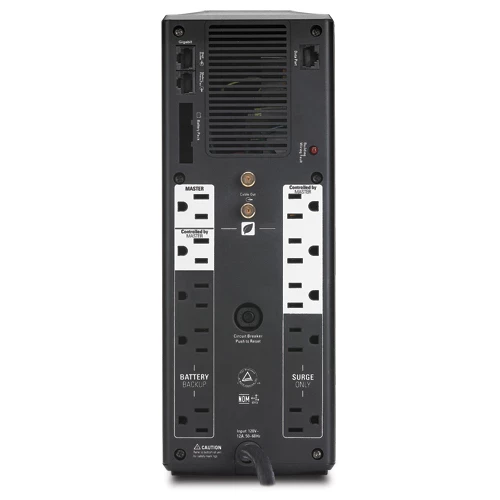 APC BR1500G. Capacidad de potencia de salida (VA): 1.5 kVA, Potencia de salida: 865 W, Frecuencia de entrada: 50/60 Hz. Tecnología de batería: Sealed Lead Acid (VRLA), Tiempo de recarga de la batería: 8 h. Color del producto: Negro, Longitud de cable: 1.83 m, Certificación: FCC 15 B, FCC 68, NOM, TUV, RoHS. Peso: 13.4 kg, Peso del paquete: 13.8 kg. Conexiones de salida: (10) NEMA 5-15R, Tipo de conexión de entrada: NEMA 5-15P, Dimensiones (Ancho x Profundidad x Altura): 112 x 381 x 302 mm