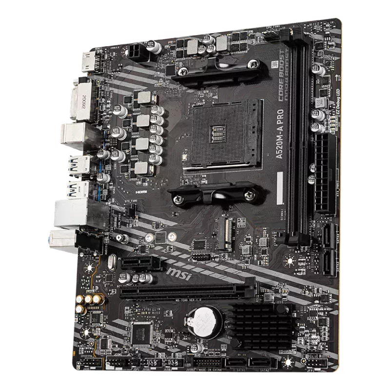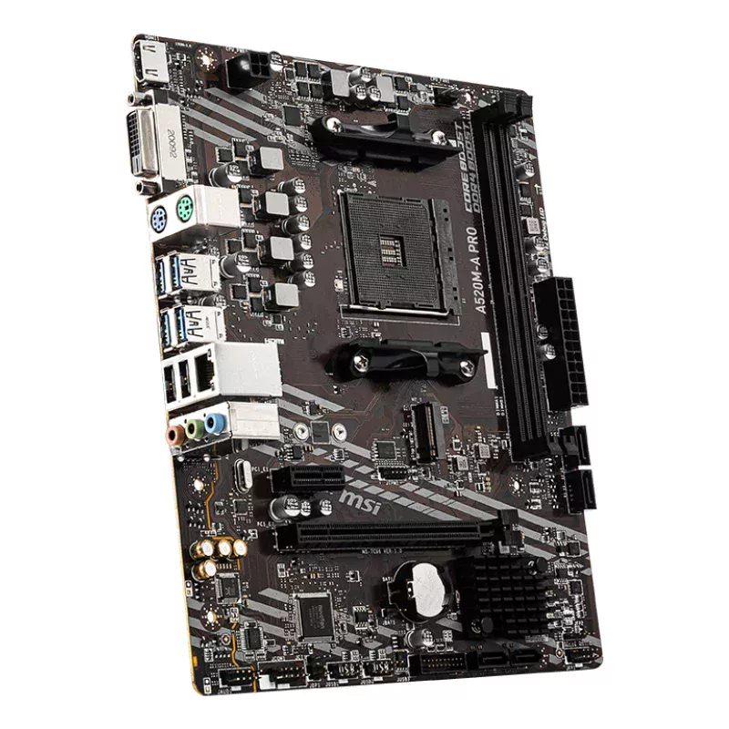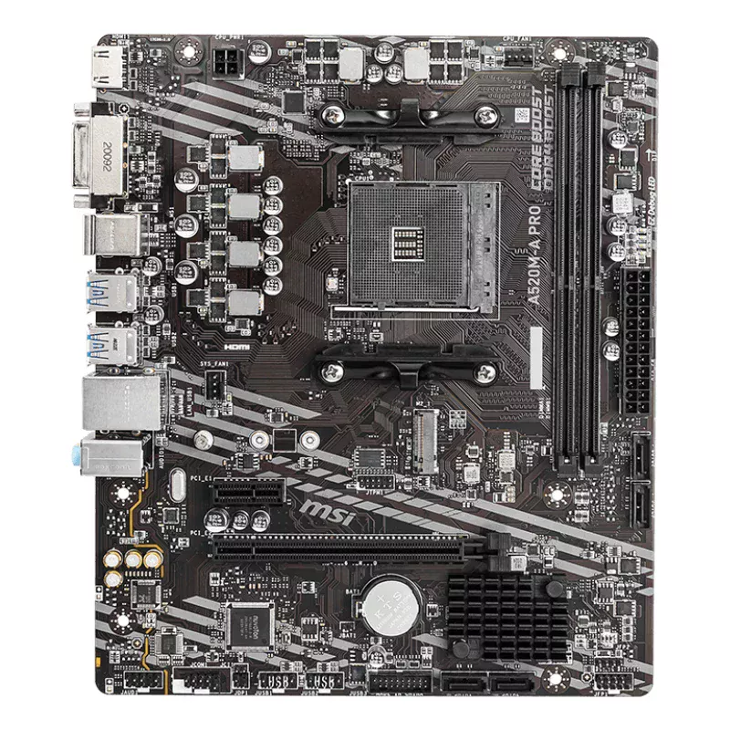 MSI A520M-A PRO. Fabricante de procesador: AMD, Socket de procesador: Enchufe AM4, Procesador compatible: AMD Ryzen 3000 Series. tipos de memoria compatibles: DDR4-SDRAM, Memoria interna máxima: 64 GB, Tipo de ranuras de memoria: DIMM. Interfaces de disco de almacenamiento soportados: PCI Express 3.0, SATA, Tipos de unidades de almacenamiento admitidas: HDD & SSD, Niveles RAID: 0, 1, 10. Máxima resolución: 4096 x 2160 Pixeles. Tipo de interfaz ethernet: Gigabit Ethernet, Controlador LAN: Realtek RTL8111H